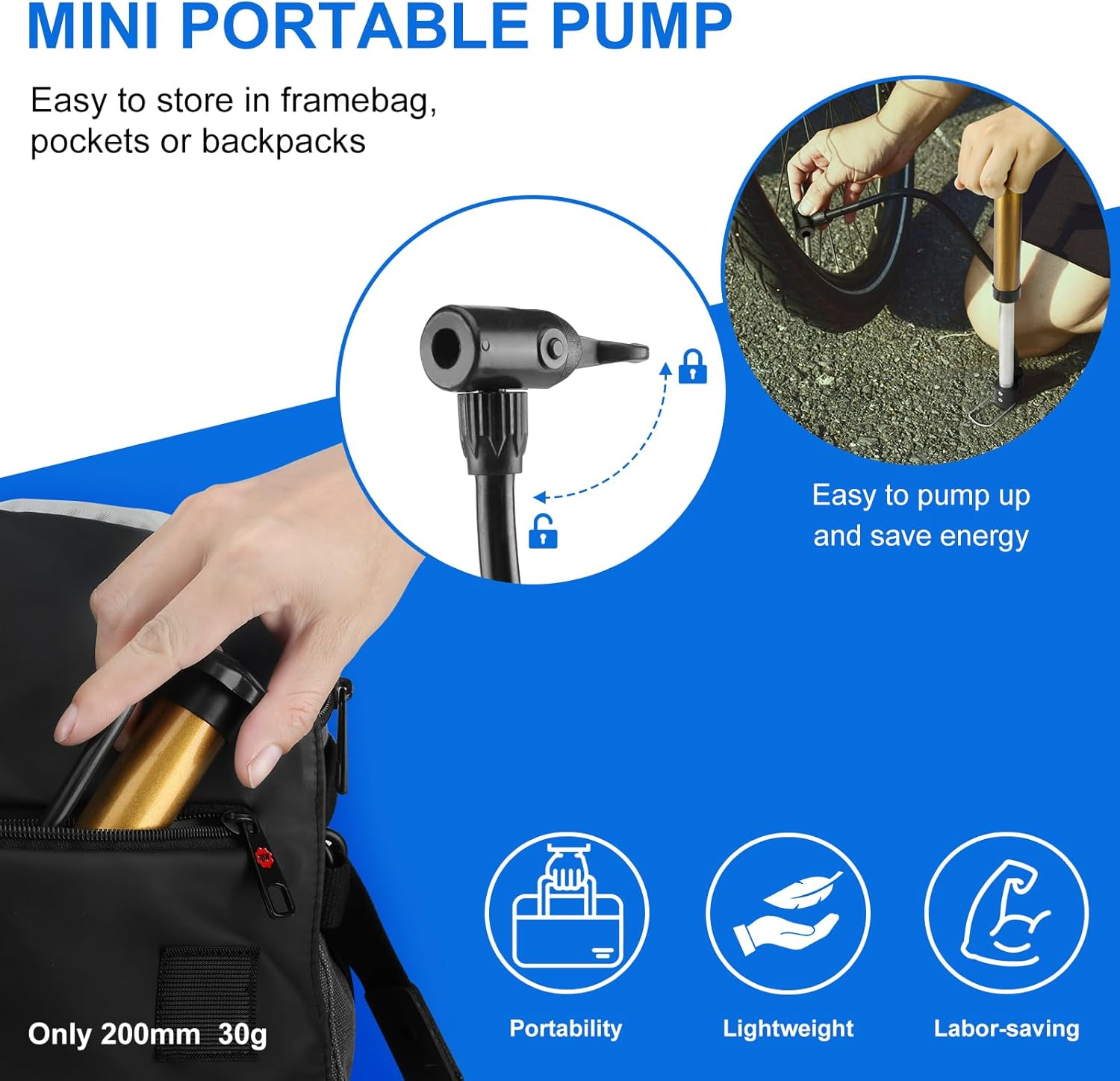 • Tire Pump:Lightweight and portable, ergonomically designed, you can inflate your bicycle tires anytime, anywhere