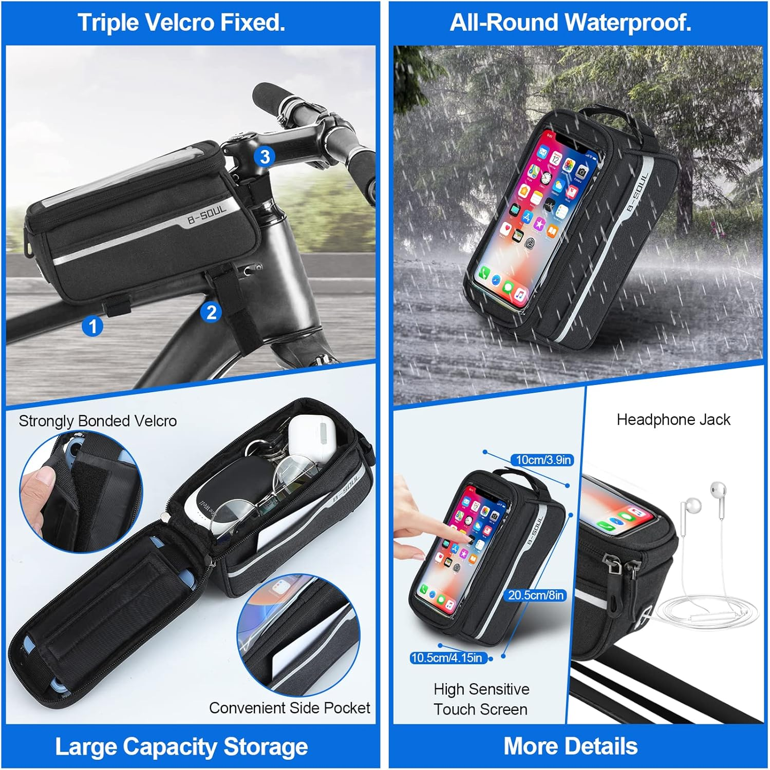 • Bicycle Bag:the The bicycle bag is made of waterproof polyester to protect the phone. It has a seamless waterproof double zipper design, with three Velcro tapes that are firmly fixed on the frame