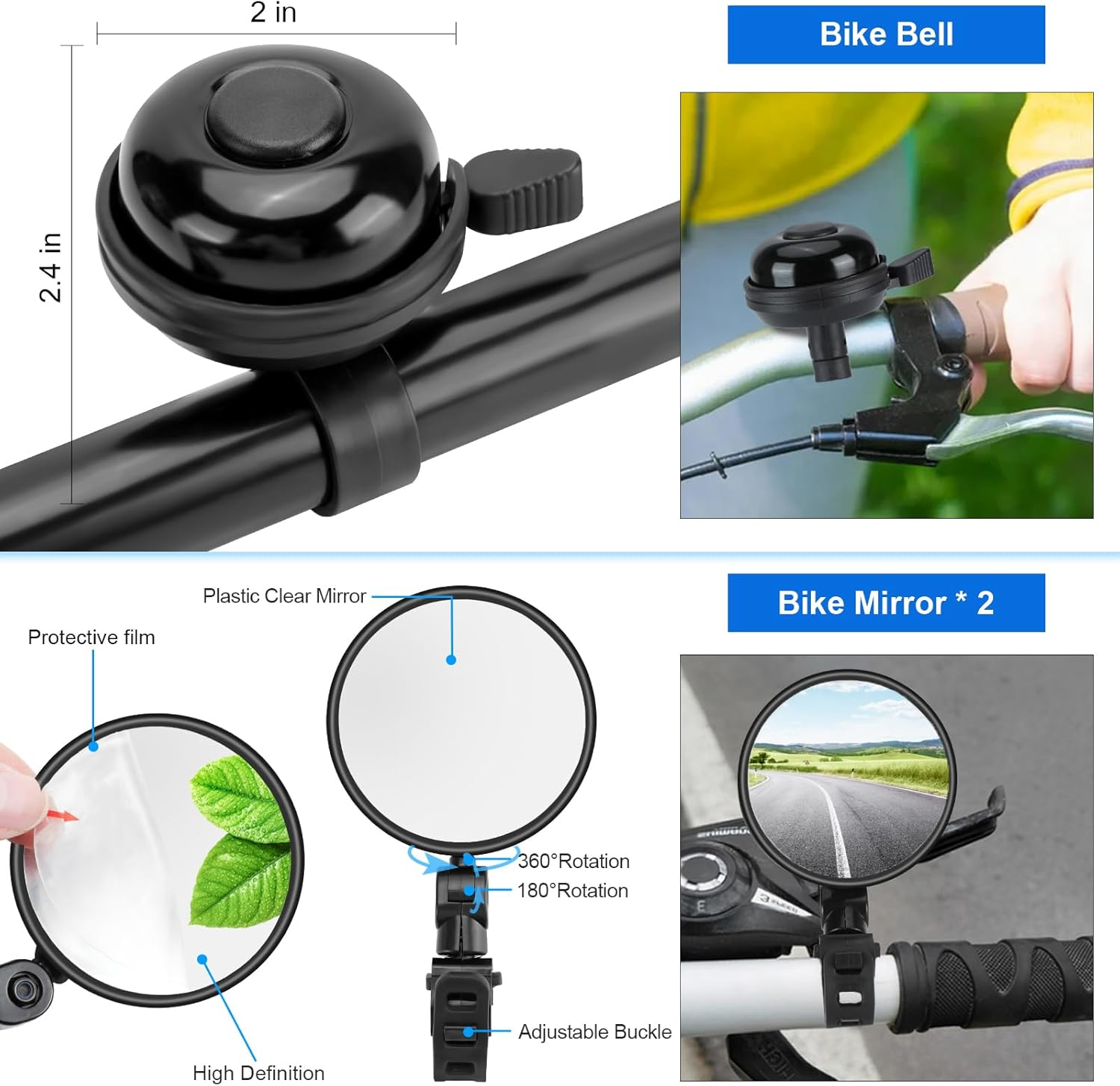 • Bicycle bell can remind pedestrians and animals when you ride, and protect your travel safety. The bell is clear and loud.