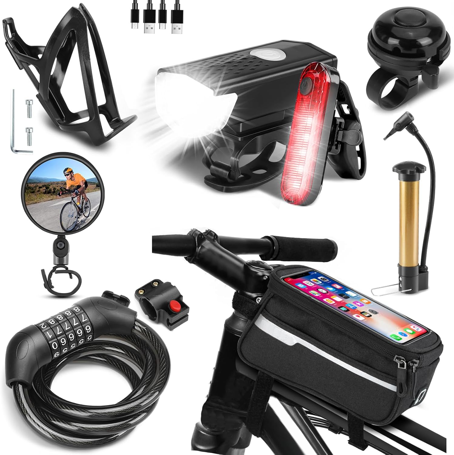 8 Pack Bicycle Accessories, Bike Light Set USB Rechargeable, 1 Bike Water Bottle Holder, Bicycle Bag and 1 Bike Aluminum Bicycle Bell,Pump