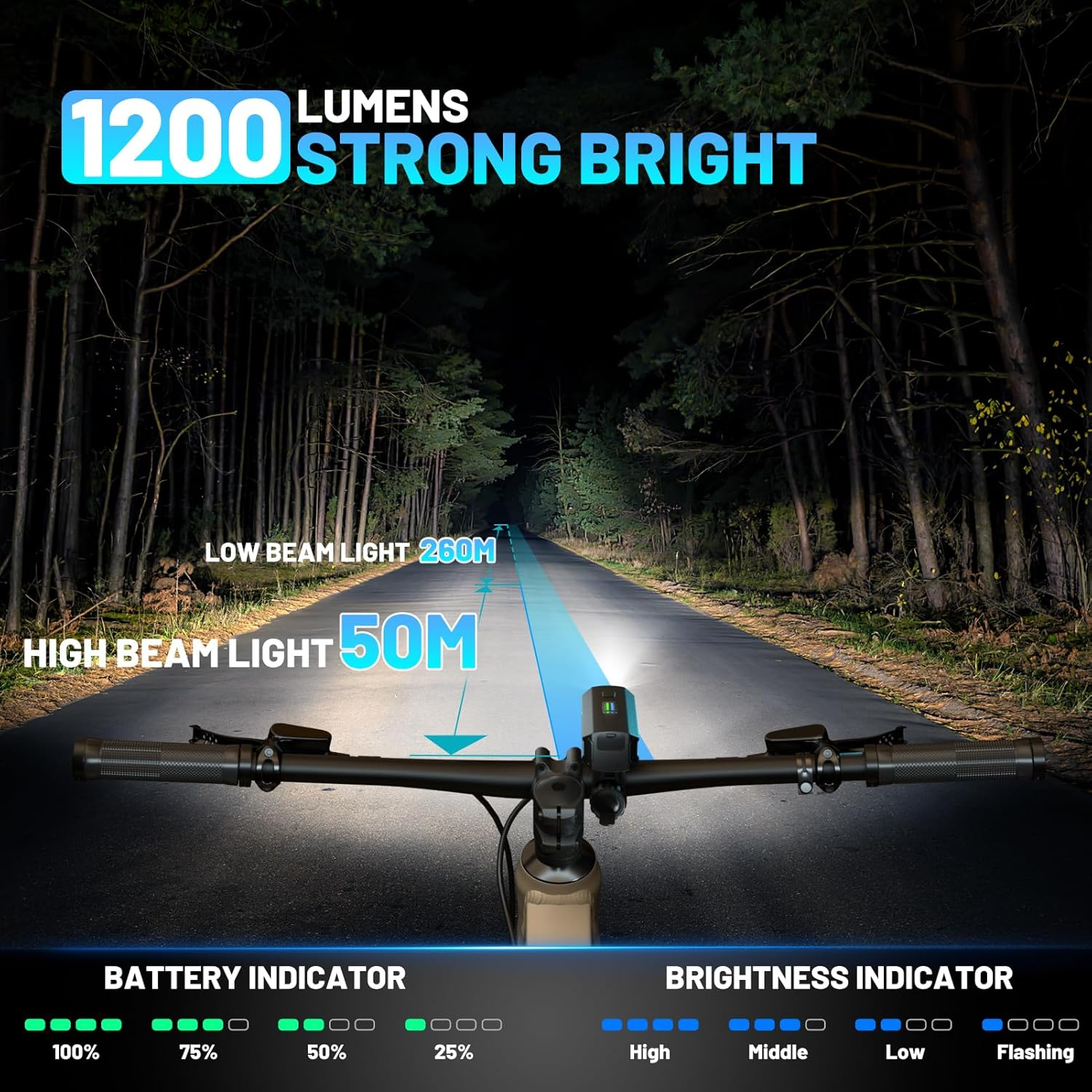 Introducing our powerful USB C Rechargeable Bike Light Set, designed to enhance your nighttime cycling experience. Whether you’re a dedicated cyclist,a daily commuter,or an outdoor enthusiast,this waterproof light is perfect for all your nighttime adventures.With a remarkable 1200 lumen output,our bike light offers strong brightness,ensuring maximum visibility and safety on the road.Its easy installation allows you to effortlessly mount it on your bicycle,making it convenient for any rider.This bike light is not only suitable for adult bikes but also perfect for kids’ bikes,electric bikes,BMX,mountain bikes,and scooters.It serves as an essential accessory for all types of riders,ensuring that you are visible to others,especially during low-light conditions.Equipped with both front and rear lights,our bike light provides a comprehensive lighting solution.The front headlight illuminates the path ahead, while the rear tail light ensures you are seen from behind. This is particularly useful for nighttime rides and off-road adventures.Our Bike Light is an ideal choice for parents who want to ensure their kids’ safety while riding at night.It serves as a reliable night light for kids’ bikes,offering peace of mind for both parents and children.Don’t let darkness hinder your biking experience.Upgrade your bike accessories with our reliable and durable bike light.It’s time to take control of your nighttime adventures with our powerful and versatile USB C Rechargeable Bike Light.