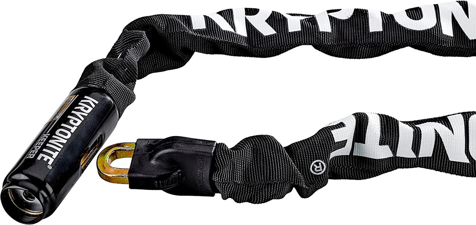 Keeper 712 Integrated Chain Lock features 7mm four-sided chain links made from 3t manganese steel. Patent-Pending End Link Design secures chain to hardened deadbolt eliminating critical vulnerability and providing extra holding power. High security disc-style cylinder is pick and drill resistant; resists most common hand tools. Durable weather-resistant nylon sleeve prevents scratches to painted finishes and protects the chain against the elements. With a 48-inch (120cm) chain length, the Kryptonite Keeper 712 is a flexible, compact and easy to use deterrent security.
