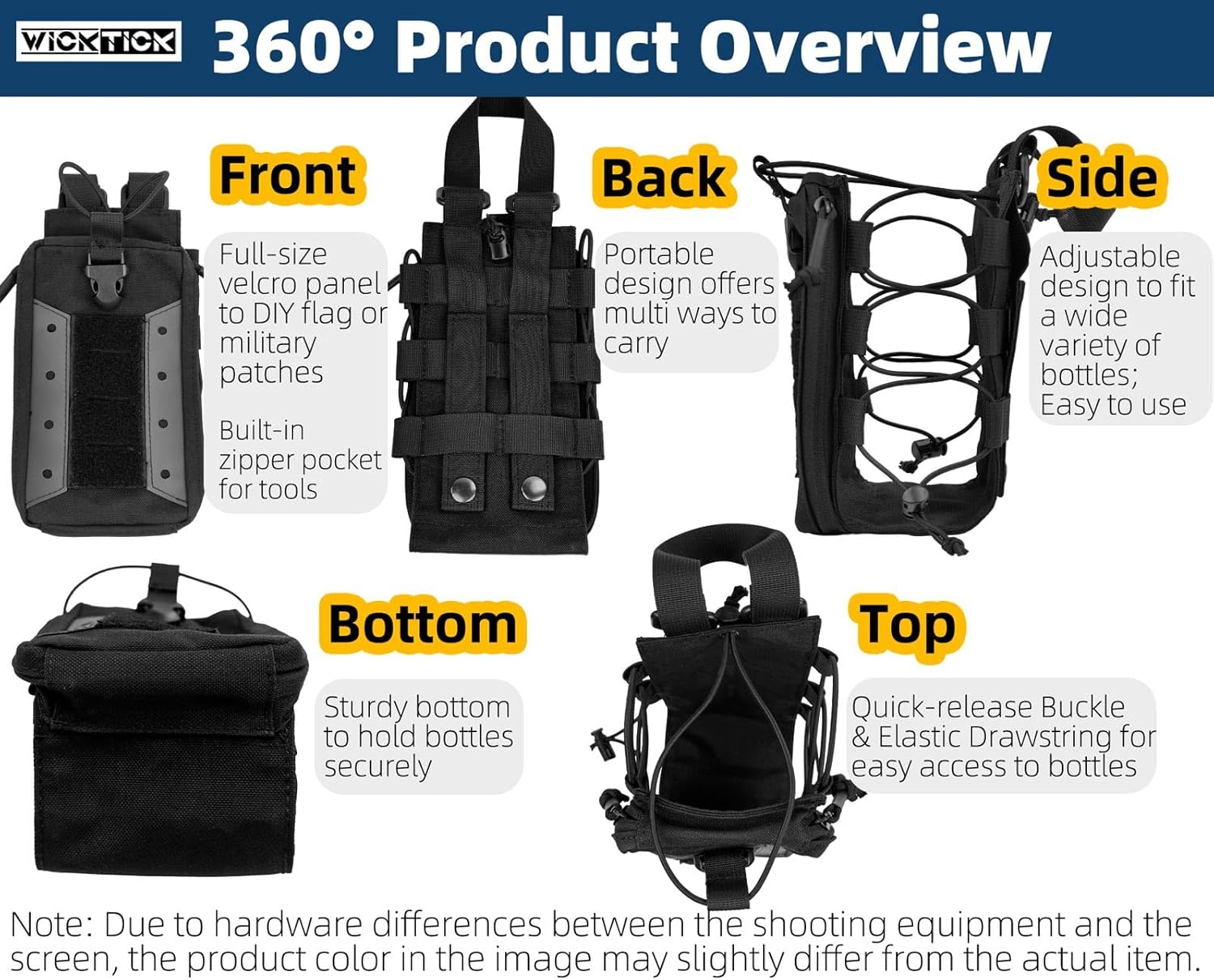 • 【Adjustable for 16-77oz Bottles】 Due to the flexible design, WICKTICK tactical bottle holder pouches “Enhanced-style” fit 16oz – 77oz / 500ml – 2200ml bottles. Since bottles vary in shape and design, make sure your bottle is less than 5″ in diameter and less than 12″ in height
