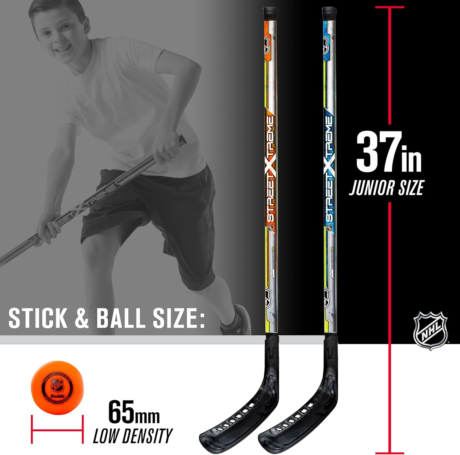 • Includes- (2) 34 inch junior hockey sticks and (1) 65 millimeter low density street hockey ball