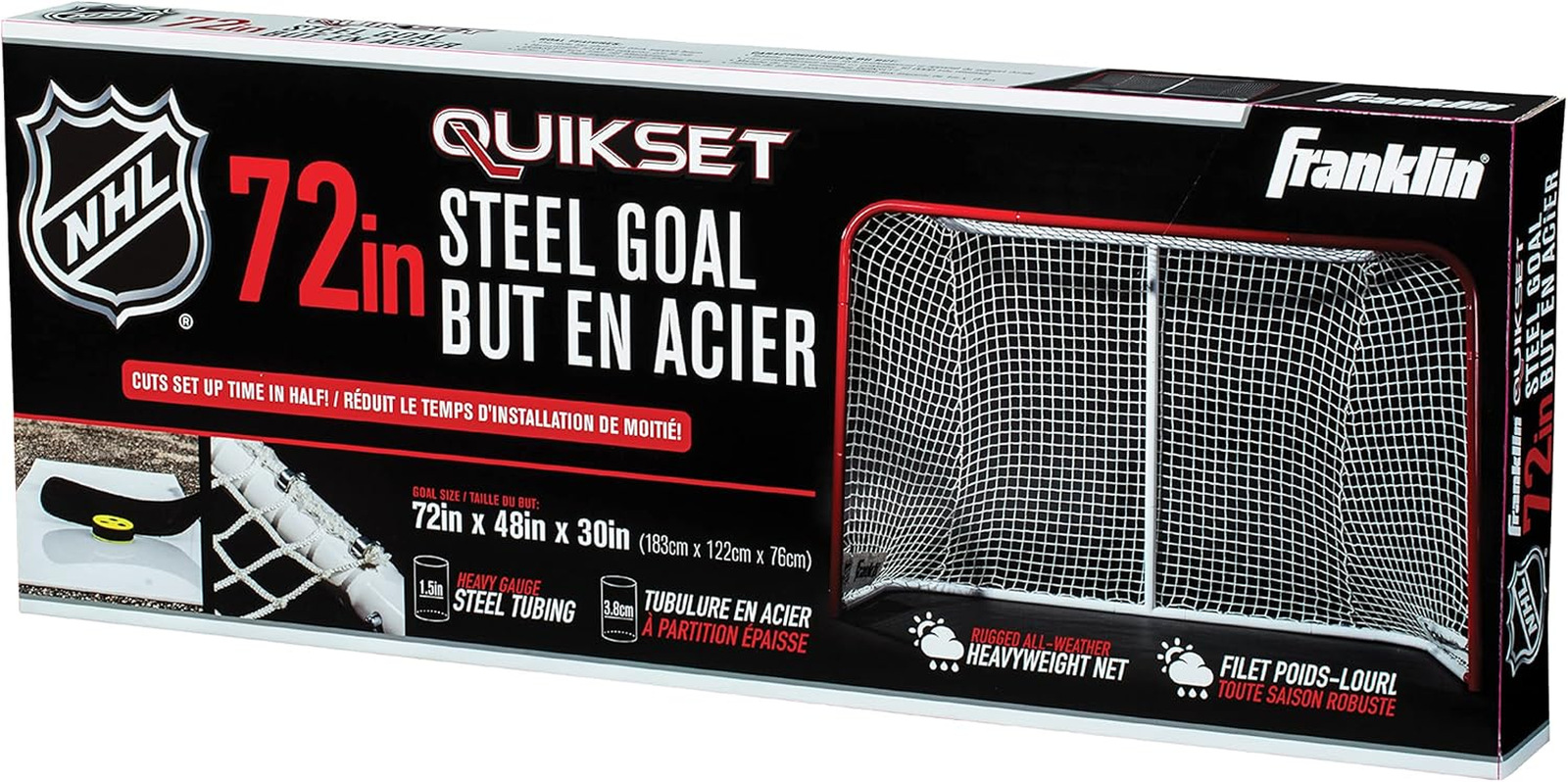 The Quickset hockey goal features the quality and durability you’ve come to expect with Franklin’s NHL steel goals, but sets up in a fraction of the time! the exclusive Quickset lock down system eliminates the time and frustration of conventional rope tie assemblies. As a bonus, each goal comes complete with a shooting board to refine your skills on any surface.