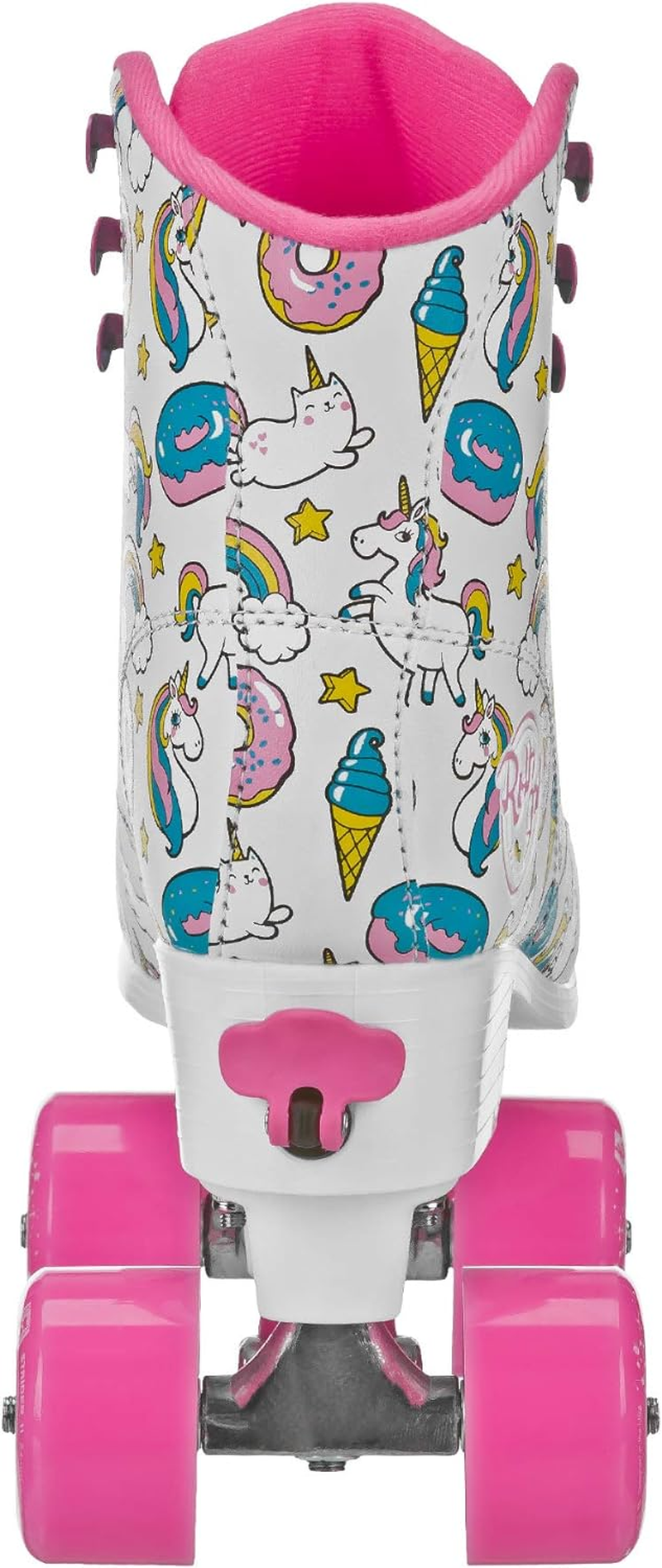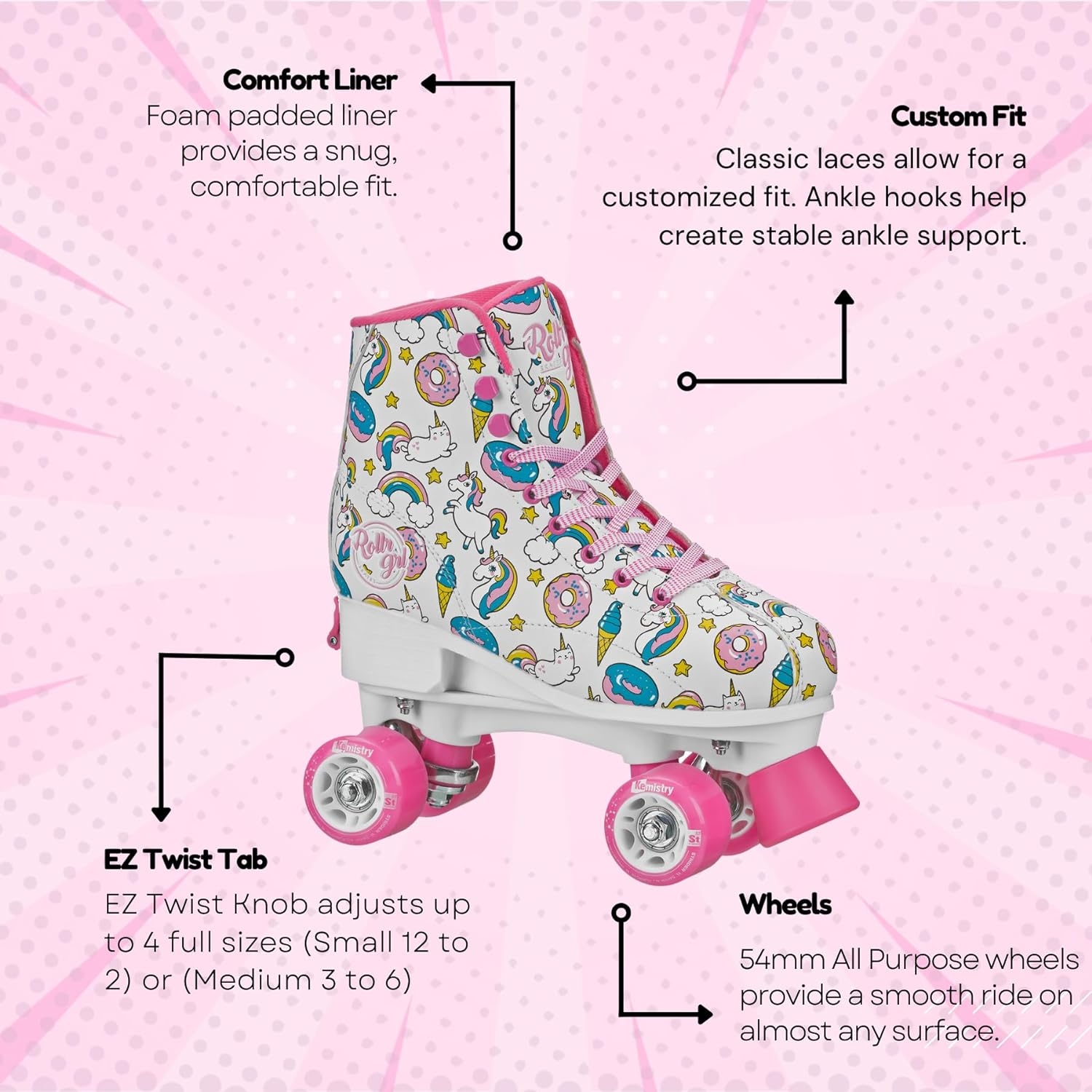 The innovative Rollr Grl Ella brings the fun of skating to growing feet. These skates will keep beginners and intermediate kids alike rolling through several sizes as they grow with the sport. The Ella features a high-top style boot with classic lace-up closure for snug support, while the EZ-Twist knob adjusts the sizing inside for the perfect fit. These quad roller skates feature a high-impact chassis that is the perfect blend of being lightweight and maneuverable. PU cushions absorb shock for a smooth ride, while metal trucks offer the right amount of stability and movement. Beginners and intermediate skaters alike will love how easy it is to turn corners and find balance on these. These artistic roller skates for girls feature high quality 54mm x 32mm Kemistry indoor/outdoor wheels. Right out of the box, these skates will roll along sidewalks and smooth pavement with just the right grip and bounce, but with clean wheels you could also take these to the indoor rink and be jam skating under the disco lights! Sizing: These adjustable kids skates run true to child’s shoe size. Small Adjusts from 12-2 and Medium Adjusts from 3-6. The Rollr Grl line of fun and stylish quads is brought to you by Pacer Skates, a leader in producing skate products for over 80 years.