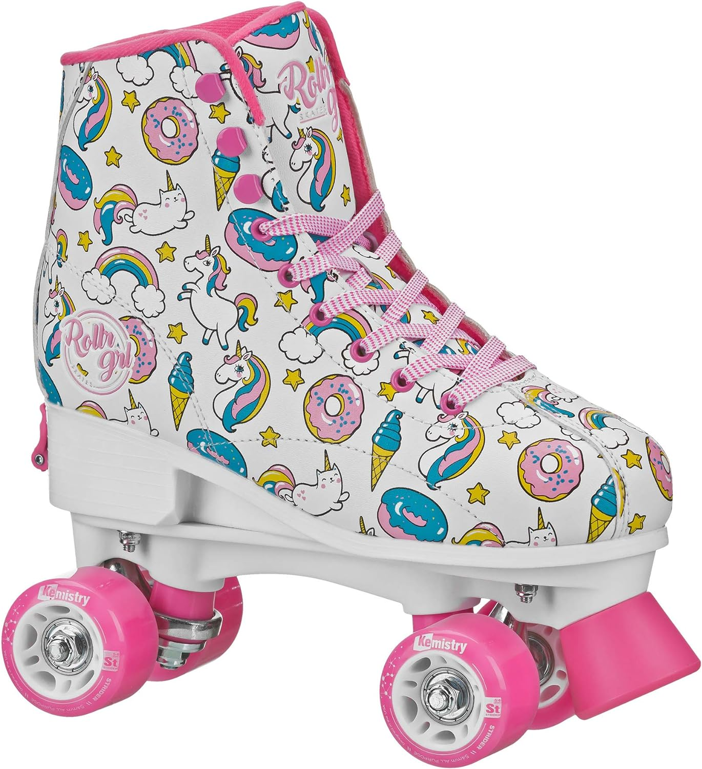 The innovative Rollr Grl Ella brings the fun of skating to growing feet. These skates will keep beginners and intermediate kids alike rolling through several sizes as they grow with the sport. The Ella features a high-top style boot with classic lace-up closure for snug support, while the EZ-Twist knob adjusts the sizing inside for the perfect fit. These quad roller skates feature a high-impact chassis that is the perfect blend of being lightweight and maneuverable. PU cushions absorb shock for a smooth ride, while metal trucks offer the right amount of stability and movement. Beginners and intermediate skaters alike will love how easy it is to turn corners and find balance on these. These artistic roller skates for girls feature high quality 54mm x 32mm Kemistry indoor/outdoor wheels. Right out of the box, these skates will roll along sidewalks and smooth pavement with just the right grip and bounce, but with clean wheels you could also take these to the indoor rink and be jam skating under the disco lights! Sizing: These adjustable kids skates run true to child’s shoe size. Small Adjusts from 12-2 and Medium Adjusts from 3-6. The Rollr Grl line of fun and stylish quads is brought to you by Pacer Skates, a leader in producing skate products for over 80 years.