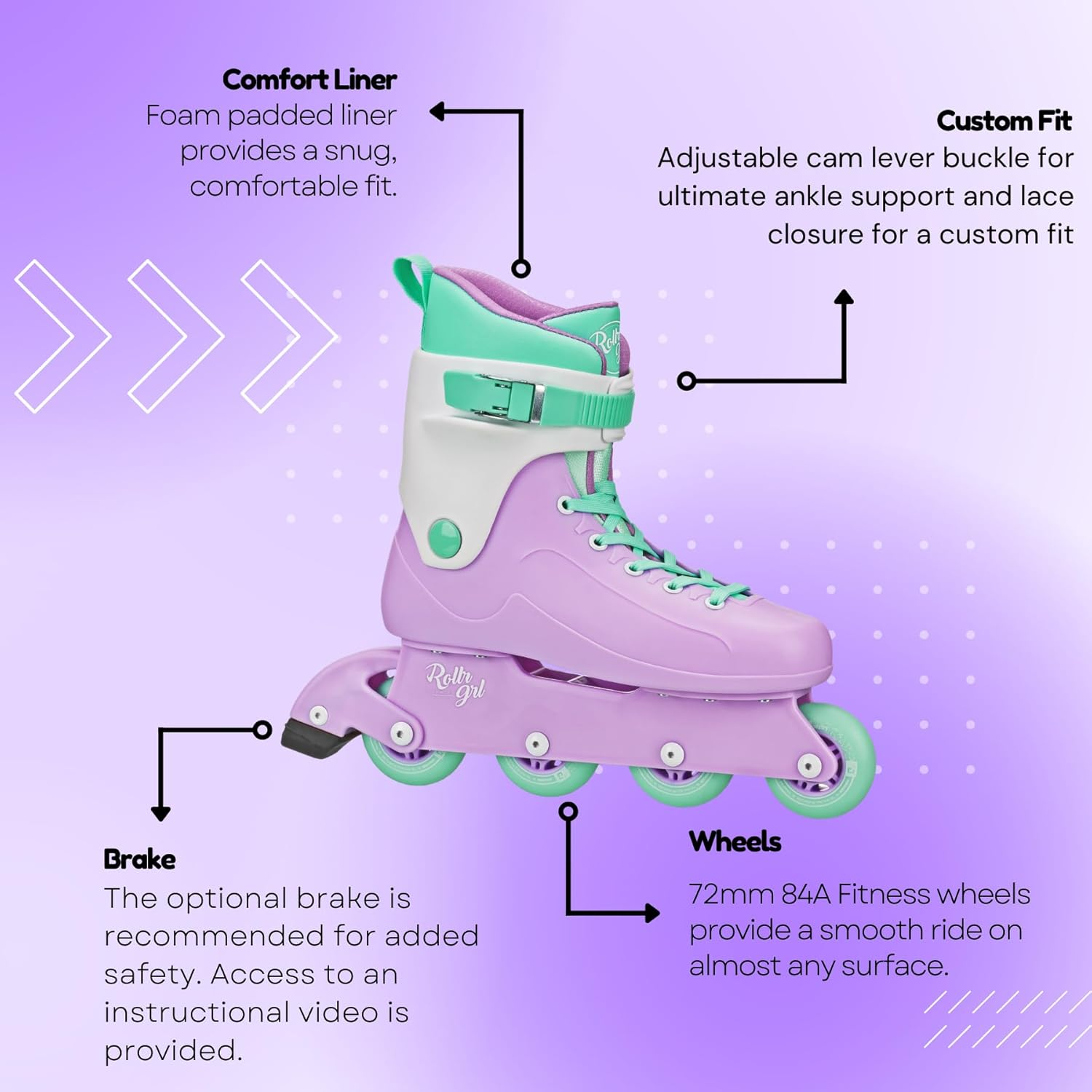 The Ocean Shore Inline Skate is the newest model in the Rollr Grl line! This fun and stylish roller blade is a great choice for recreational skaters looking for quality components and unique design. This inline skate is designed for men or women and is equipped with fitness wheels for indoor or outdoor skating. The sturdy molded boot is equipped with a form comfort padded liner, making this skate durable and comfortable right out of the box. The lacing system and cam lever ankle buckle provide a personalized fit and ultimate support. An optional brake and tools for installation are included, along with instructions and an informational video.