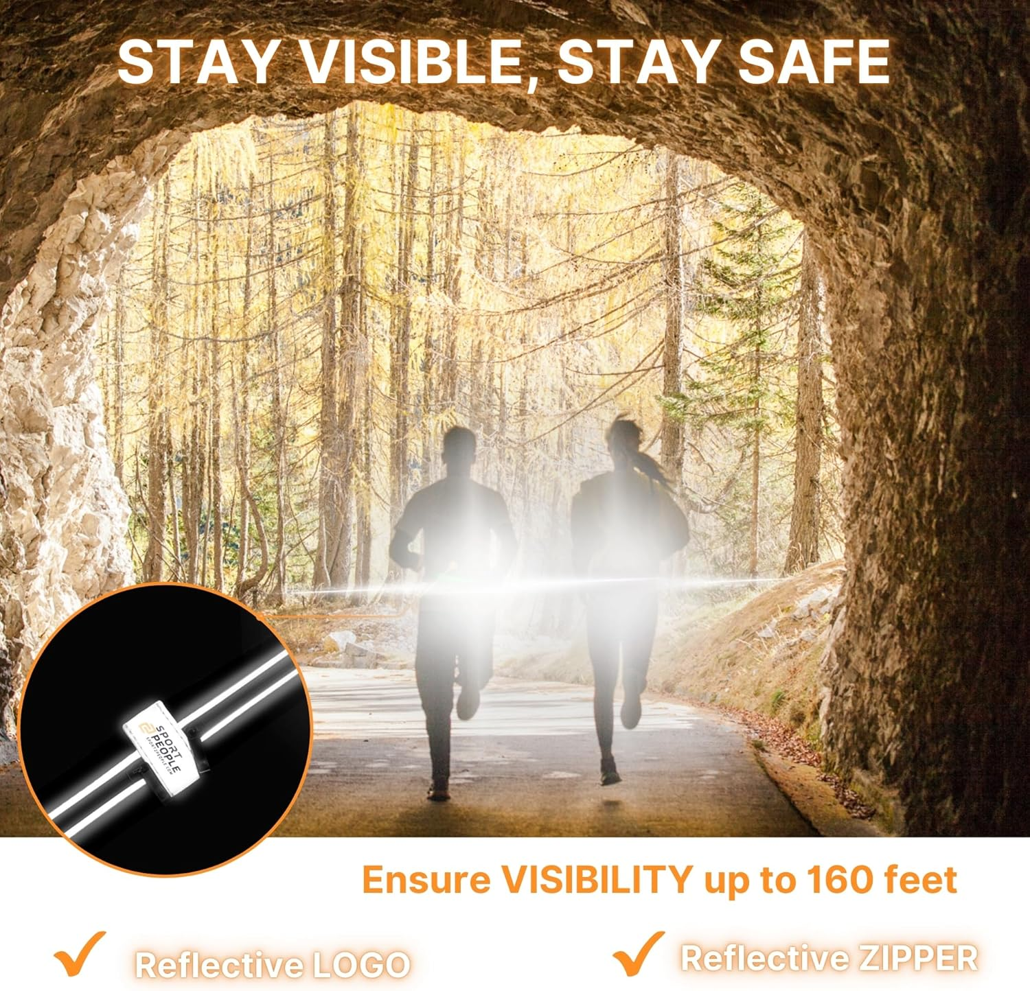 • 𝗘𝘃𝗲𝗿 𝗳𝗲𝗹𝘁 𝘂𝗻𝗲𝗮𝘀𝘆 𝗿𝘂𝗻𝗻𝗶𝗻𝗴 𝗶𝗻 𝘁𝗵𝗲 𝗱𝗮𝗿𝗸? Run with total peace of mind! Reflective strips on waist pouch ensure visibility up to 160 feet, make you safe and seen during late-night jogs or early morning workouts. You’re protected, every step of the way.
