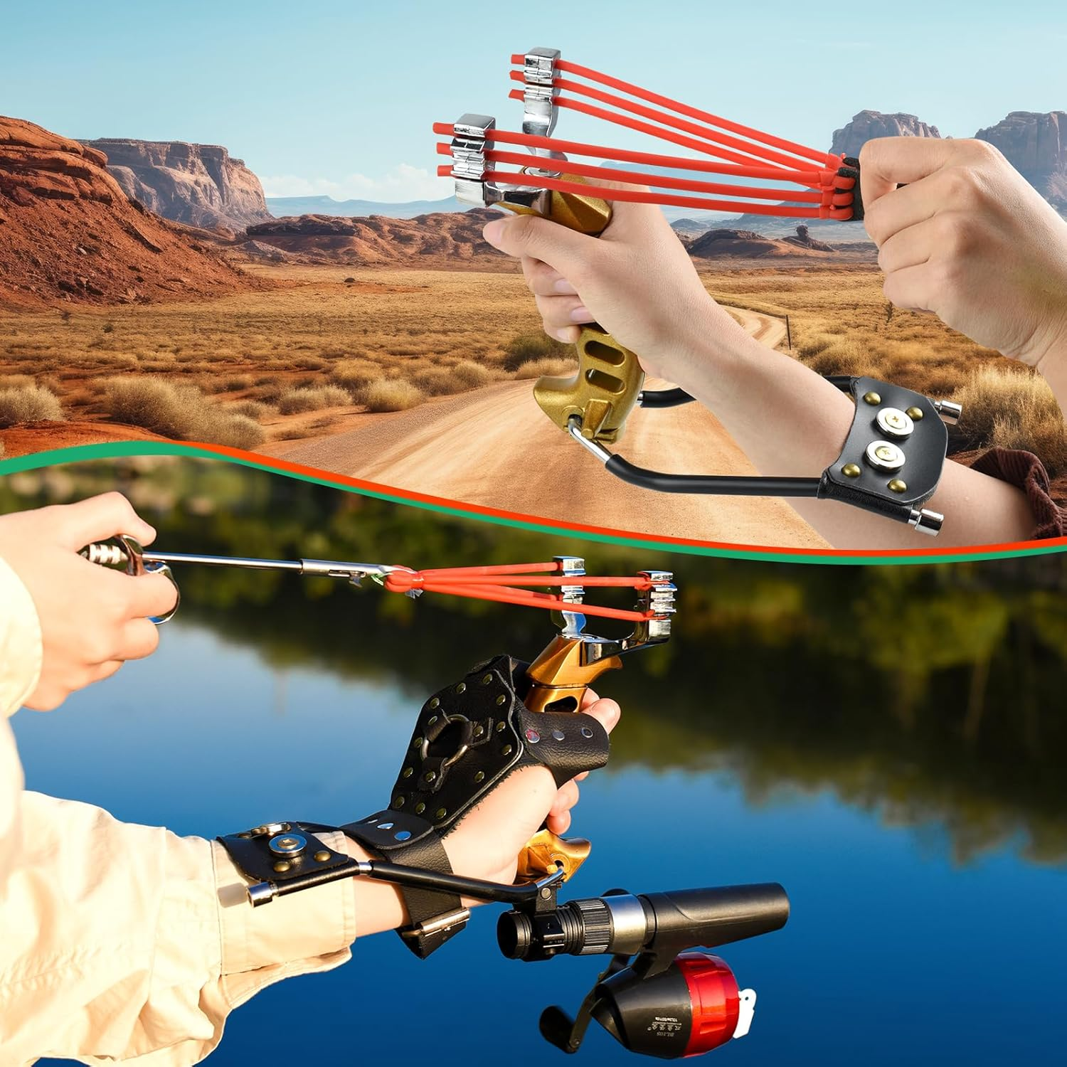 - √This slingshot has two gameplay options. Install the fishing reel and it will be an excellent fishing slingshot. We also offer three fish darts as a gift, so you can go to the river to shoot fish. When you remove the fishing reel, it will turn into a powerful hunting slingshot again. You can put on the hunting Slingshot rubber band we come with, pick up mud balls, steel balls, and small stones to shoot. Very powerful, please pay attention to safety.