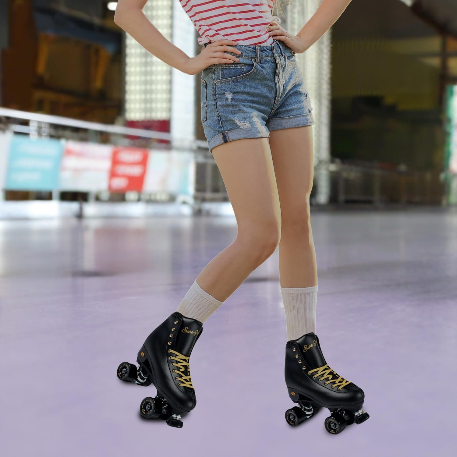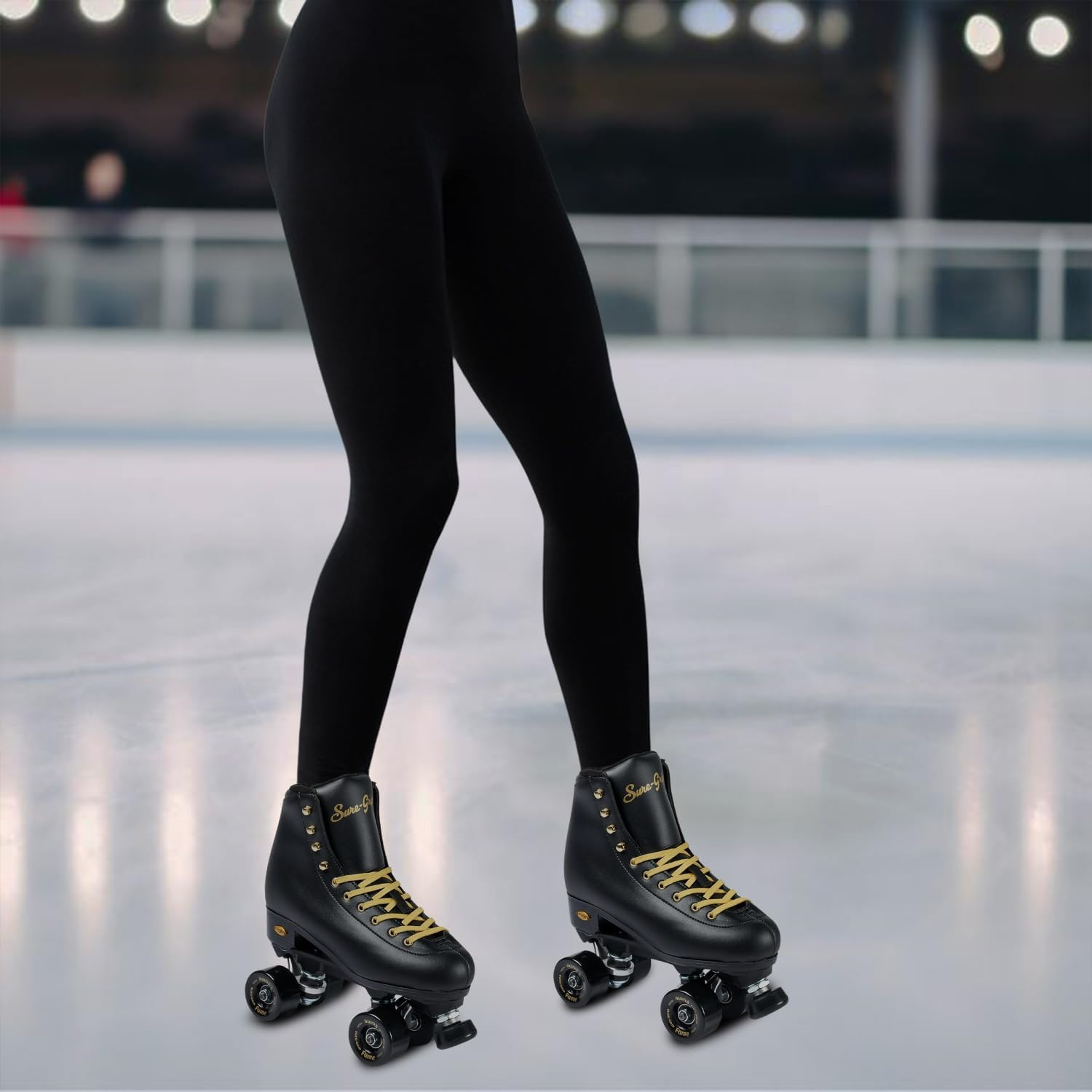 Sure-Grip Fame Black & Gold Roller Skates are designed for both men and women, featuring a superior-quality vegan boot for long lasting durability